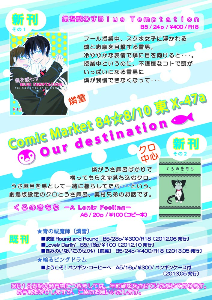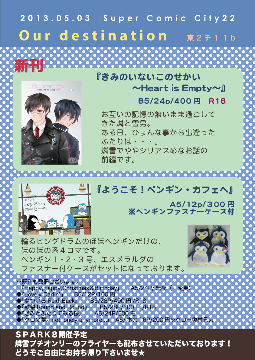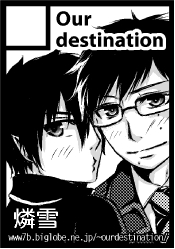 雨雲ぺんきんによる同人誌サークル【Our destination】のお知らせブログです。 個人が趣味で運営する同人サイトです。 作者、及び各メディアとは一切関係ありません。 また同性愛的表現に嫌悪感を感じる方はお引き返しください。 参加イベントや新刊等のお知らせの他、Our destination広報担当(笑)松葉ぼたんの雑記。